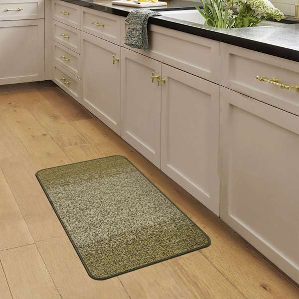 Our 21x34in. Ombre Green Puffback Washable Kitchen Mat lets you express your style as you welcome friends and family in for special occasions and it softens the stance in hard floor areas. With a green, taupe and tan graduating ombre motif, this comfy polyester mat coordinates with all your seasonal decor.