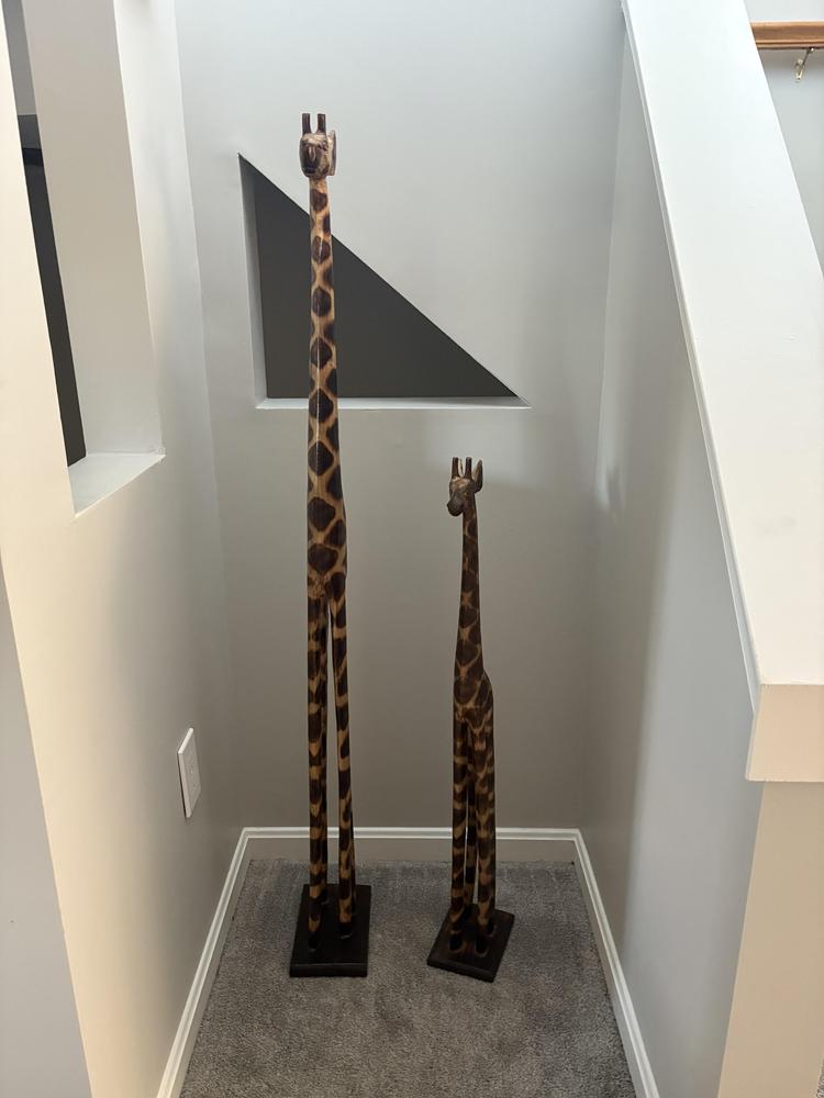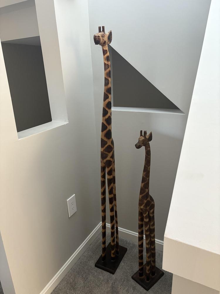 Add a touch of whimsy to your home decor with this oversized giraffe accent. Crafted from wood, this charming piece offers a delightful way to infuse your space with a hint of the wild.