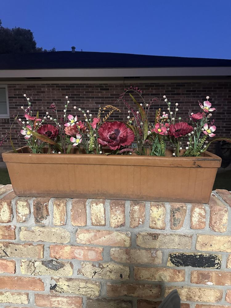 I placed these pretty faux flowers on my outdoor porch combined with real perennial greenery. Love the look.