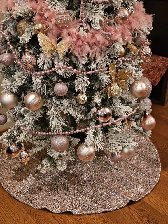 Give your tree a soft blush of sparkle with this 48in. Pink Sequin Tree Skirt. A field of pink sequins catches the light for a festive glow, while the timeless round silhouette keeps the look refined. The round silhouette offers generous coverage to frame the base and conceal hardware and cords. Smooth fabric construction lays flat and stores easily after the season. An easy way to refresh your holiday setting with shine and charm.