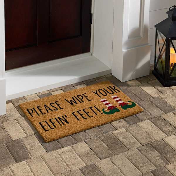 Bring holiday cheer to your entry with the 18x30in. "Please Wipe Your Elfin' Feet" Coir Doormat. The playful elf legs graphic and bold message set a friendly tone while giving guests a clear cue. Crafted from natural coir, the textured surface helps brush dirt from shoes and boots. The rectangle shape in a warm natural color pairs well with Christmas decor and everyday styles. A festive front door mat that keeps your entryway tidy all season.