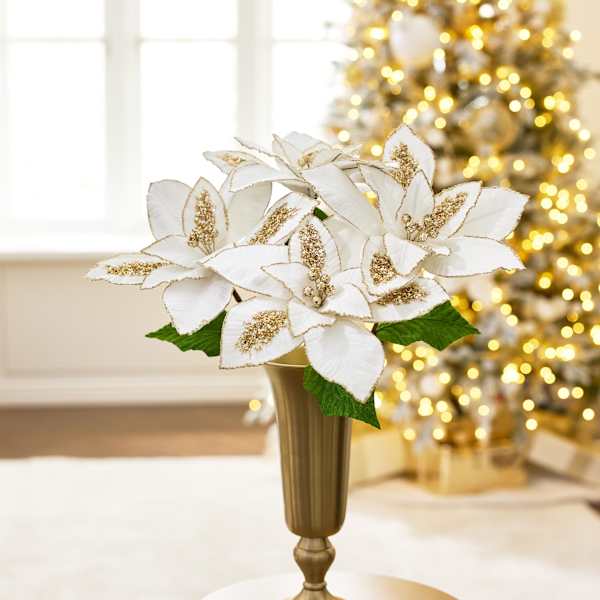 Bring a touch of winter elegance to your holiday decor with this 25in. white artificial poinsettia stem. Crafted with soft fabric petals, it adds airy texture and a clean, timeless look to wreaths, garlands, vases and tree styling. This faux pick offers graceful height without overwhelming your arrangement. Mix with evergreens, pinecones and metallic accents for a serene Christmas palette. A simple way to refresh seasonal displays that stays fresh looking all season.