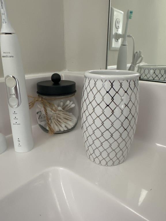 With its classic white and gold checkered design, this tumbler effortlessly blends into any bathroom decor, adding a touch of sophistication to your daily routine. Keep your counter clutter-free and your dental necessities organized in style.