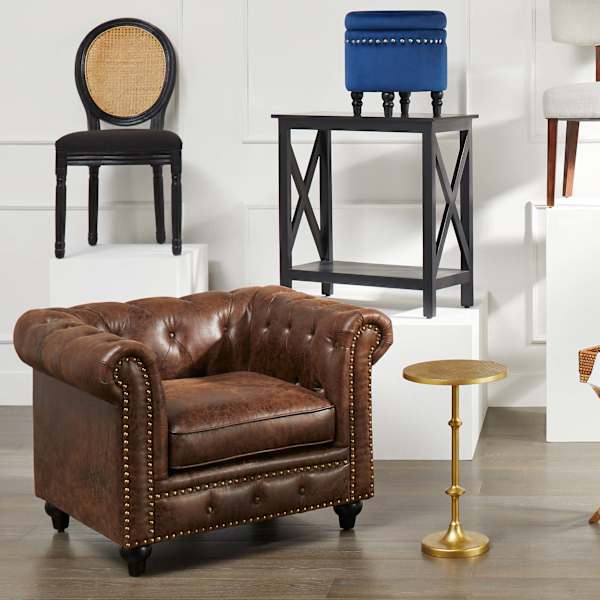 A collection that lets everyone relax in style. Polished finishes and classic hues pair with fun finds. Providence is where elegant settings still feel comfortable and warm - exclusively At Home. Designed with the classic Chesterfield style in mind, our ever-so-stylish piece hits all the traditional design elements. Featuring a brown faux leather upholstery, deep button tufting, slightly scrolled arms, and turned bun feet in an elegant dark finish. Perfect for the office or library, this calming gray upholstered armchair is the ideal sitting spot for hours of work or relaxation (by the way, it's perfect for the living room, too).