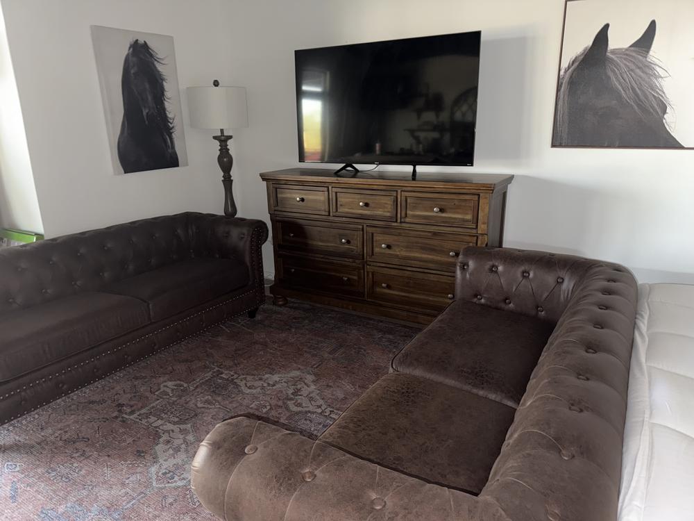 Designed with the classic Chesterfield style in mind, our ever-so-stylish sofa hits all the traditional design elements. Featuring a rich dark brown leather/faux leather upholstery, deep button tufting details, slightly scrolled arms with top button tufting, nail head trim detailing and turned bun feet in an elegant dark finish, the perfect couch for the office or library, this rich brown upholstered sofa is the ideal sitting spot for hours of socializing or relaxation (by the way, it's perfect for the living room, too).