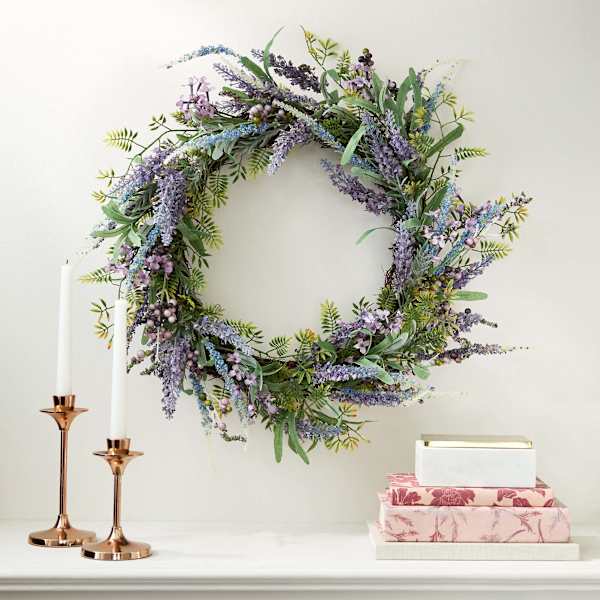 The Purple Lavender & Berry Wreath adds a touch of vibrant charm to your space. Crafted with lovely polyester lavender, this wreath brings a burst of natural beauty indoors, year-round.