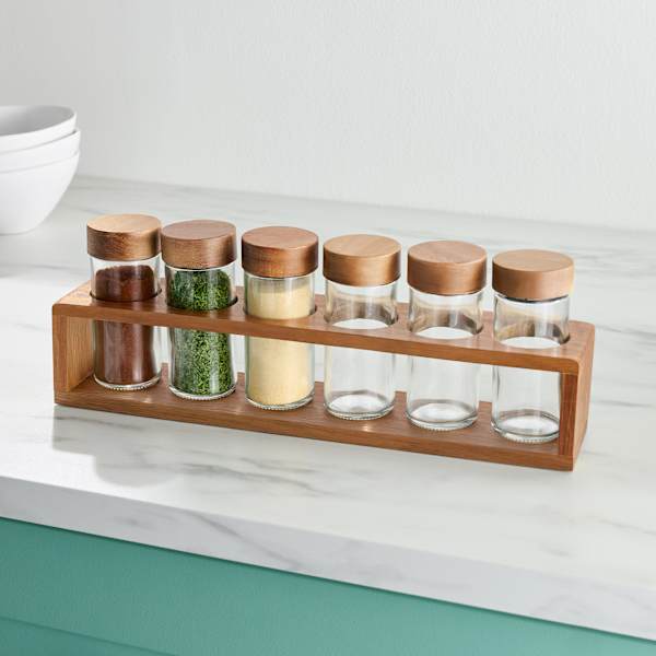 This spice rack includes six glass jars with acacia wood lids for stylish storage. The rounded edge design softens the look while maximizing counter or cabinet space. This is a practical and customizabe solution for every day cooking.
