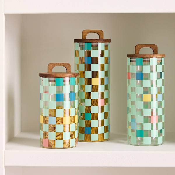 Green Check Print Glass Canister with Acacia Lid, 34oz