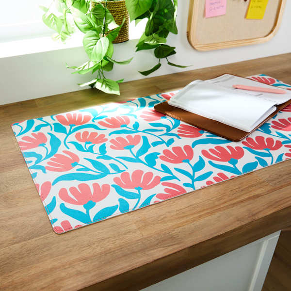 REAL SIMPLE Light Blue Floral Faux Leather Desk Pad, 31x15.5