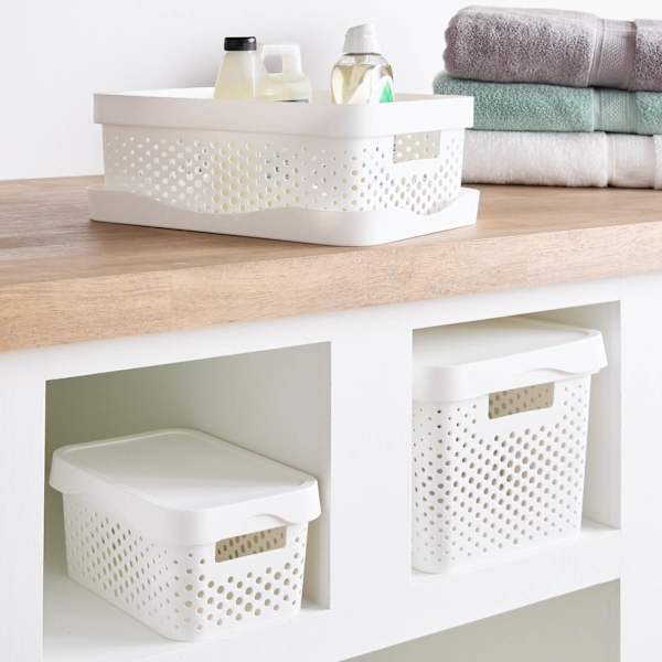 Organization should be easy-our designs make every corner of your home more livable. The dot design on this storage bin gives you some visibility to see what is inside, while keeping it mostly out of sight. An included lid keeps clutter at bay, and allows you to stack other bins and maximize your vertical space.
