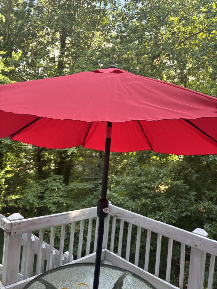 You'll have it made in the shade with our red 7.5-foot umbrella. Entertain guests in style with this aluminum patio umbrella that's just as much functional as it is a decorative piece. Designed with style in mind, the fabric blocks UV rays, keeping you and your guests completely comfortable. Plus, with 8 ribs, tilt and crank mechanism and a pole that fits most patio tables and umbrella stands, this umbrella offers excellent value while casting its shady pleasure.