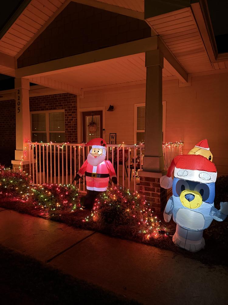 Brighten your holiday scene with our Bluey in Santa hat, beaming from ear to ear. This 3.5ft. airblown inflatable features plug-in LED lighting for a soft, even glow. Sized to fit comfortably by the entry or on a small patio. Made of polyester in Bluey's signature blue, the playful Christmas character stands out day and night. It brings a fun, friendly touch for fans of all ages.