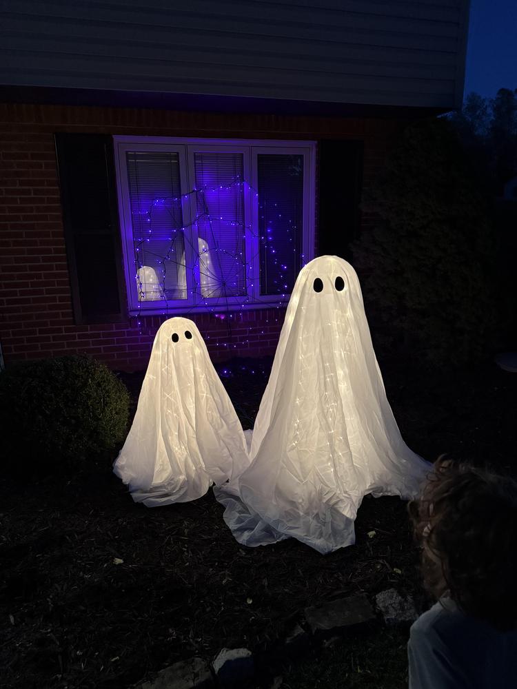 Welcome your neighbors and trick-or-treaters and create an otherworldly spooky atmosphere with our Set of 2 Lighted Ghosts that are sure to be a hit in any haunted house. These light-up Ghosts make perfect seasonal Halloween decor for any room, the front porch, and in the yard when hosting a Halloween party - Let this festive pair guide guests and trick-or-treaters to your front door. Made of fabric with easy to set up frames, simply plug in and enjoy the display.