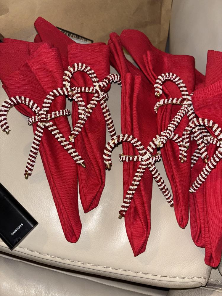 Bring classic holiday cheer to your table with this set of four 4in. Candy Cane Napkin Rings. Bright red and white stripes with a hint of green create a playful, Timeless look for Christmas place settings. They are crafted from metal with a smooth, glossy finish. Each ring slides easily around cloth napkins and storing compactly. Style them with plaids, neutrals, or metallics to refresh your holiday table decor. A simple, eye-catching accent that ties your winter table together.