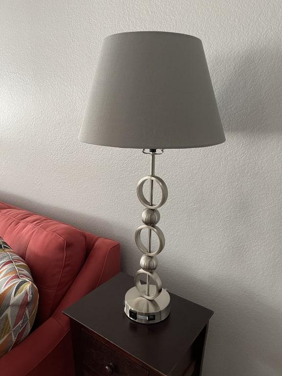 - Silver metal table lamp with USB port.