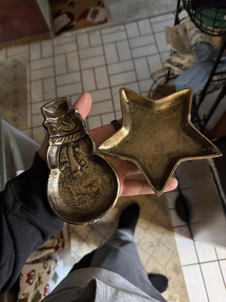 Bring merry charm to your space with this 6in. Snowman Trinket Tray, crafted from metal with a cheerful gold finish. The playful snowman shape keeps rings, keys, coins, and small essentials tidy while adding festive style to your tabletop decor. It fits effortlessly on an entryway console, nightstand, mantel, or desk. Smooth, sturdy metal is easy to wipe clean and ready for daily use throughout the season. Mix it into your Christmas decor for a bright accent that keeps clutter under control. A sweet gift idea for holiday hosts and a fun upgrade for any seasonal decor collection.