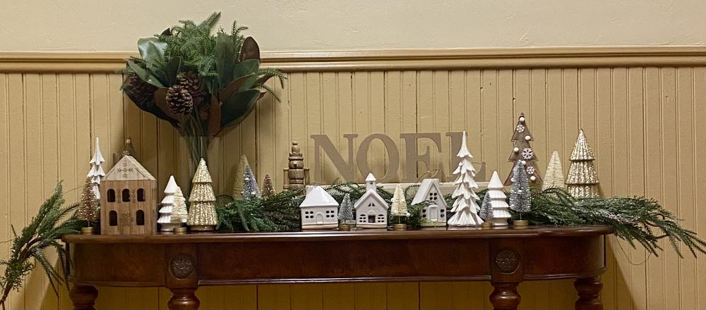 Bring natural holiday texture to your space with this 18in. Soft Pine and Magnolia Leaf Arrangement in Glass Pot. Lush magnolia leaves mix with airy pine for a full, layered look that stays vibrant season after season. The clear glass base with faux water gives it a clean, modern finish that suits entry tables, mantels, and coffee tables. Crafted from realistic plastic greenery, it delivers evergreen style without upkeep. Works beautifully as a holiday centerpiece or winter greenery accent. A timeless Christmas arrangement that blends with both traditional and modern decor.