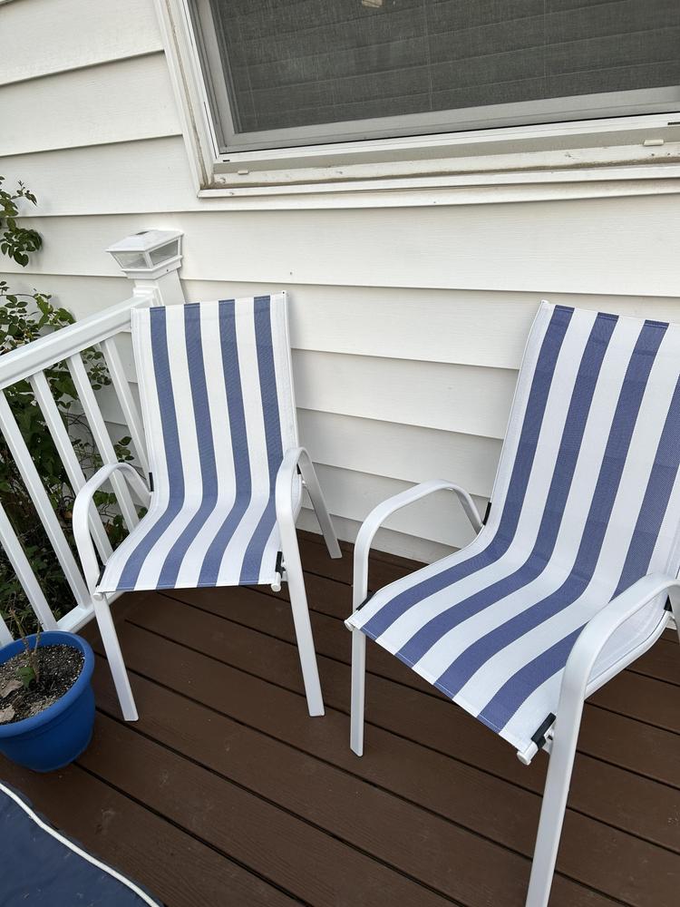 Escape the indoors and get outdoors with our stackable Blue and White Cabana Stripe Stacking Sling Chair. Buy in multiples and be sure to have enough outdoor seating for family and friends. This outdoor metal dining chair features a simple streamlined look with a white metal frame and a comfortable mesh fabric that's breathable. These stacking chairs will last even longer if protected from the elements. Pair with any patio table or garden stool and enjoy the great outdoors to the fullest.