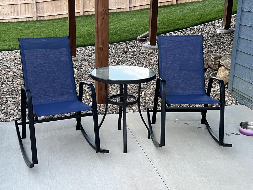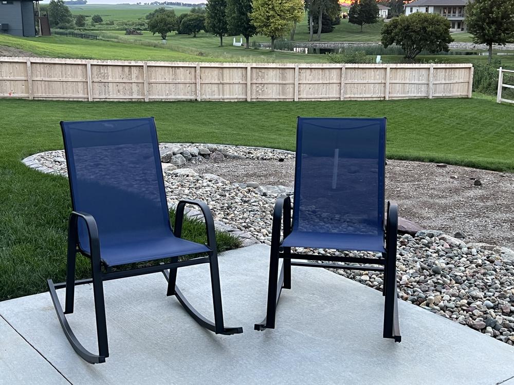 Escape the indoors and get outdoors with our navy blue Sling Stacking Rocker. Buy in multiples and be sure to have enough outdoor seating for family and friends. This outdoor metal rocking chair features a simple streamlined look with a metal frame and a comfortable mesh fabric that's breathable. Pair with any patio table or garden stool and enjoy the great outdoors to the fullest.