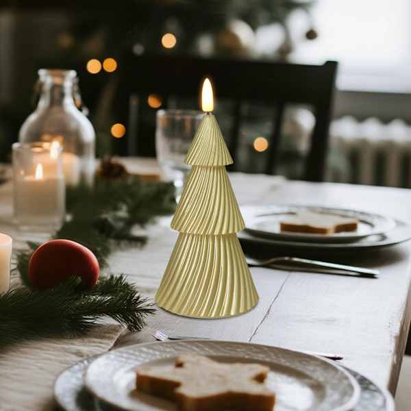 Bring a cozy holiday glow to your home with the 3x7in. Twill Christmas Tree LED Candle with Timer. Crafted from real wax with a striped texture, it shows off a soft gold hue that suits any seasonal decor. The flameless LED offers a gentle flicker, while the built-in timer takes care of your evening ambiance. This LED candle fits perfectly on mantels, shelves, and entryway tables. The cordless design makes styling simple in centerpieces or nooks without worry about open flames. Mix it with garland and ornaments for a festive scene that lasts all season.
