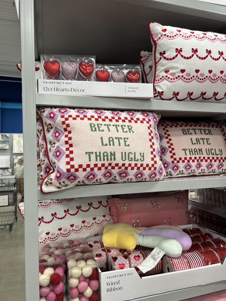 Add playful charm to your space with the Valentine's "Better Late Than Ugly" needlepoint lumbar throw pillow. The pink, green and red cover showcases stitched  heart details, and a cheeky message that brightens sofas, beds, and accent chairs. Made from soft polyester and cotton with a plush feel, it brings cozy support in a slim oblong shape. At 20x14in., it layers effortlessly with your favorite pink and red accent pillows. A sweet Valentine's Day decor piece and an easy gift for anyone who loves a fun, modern touch.