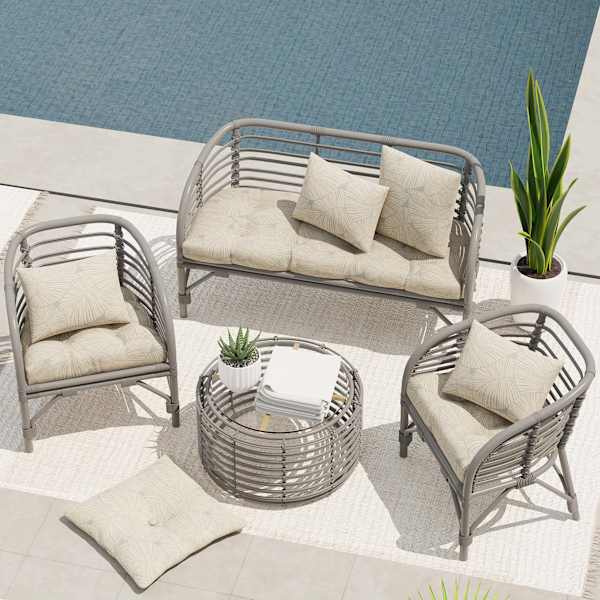 Explore what's right around the corner. Choose your own adventure every day. Savor it all and say yes to what comes next. Found & Fable is a collection only found at At Home. It's polyester construction and all-weather capability make this Found & Fab le Talia Palm Outdoor Wicker Settee Cushion a must-have for outdoor entertaining. Create a stunning patio, porch or deck that will be the talk of the neighborhood. Check our overall selection for a variety of shapes, sizes, patterns and colors to fit the personality of your patio.
