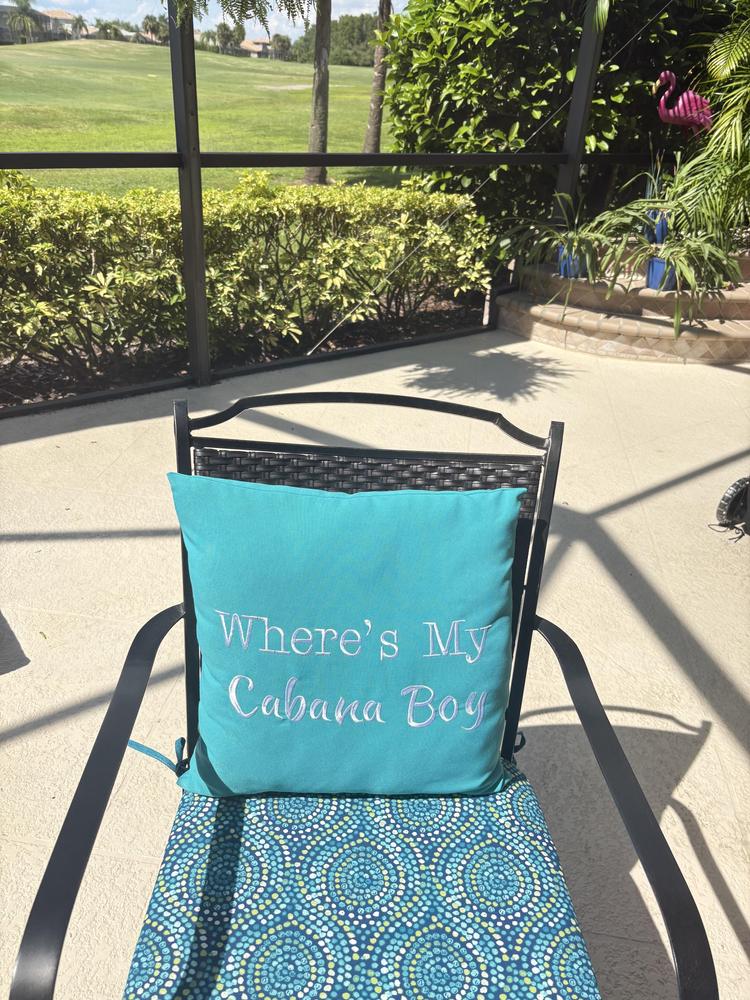 Transform your outdoor space into a vibrant oasis with the "Where's My Cabana Boy" Turquoise Square Outdoor Throw Pillow. Featuring a cool turquoise color, this stylish throw pillow instantly adds a pop of color and personality to any patio or garden.