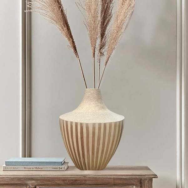 White Eggshell & Stripped Bamboo Vase, 12.2"