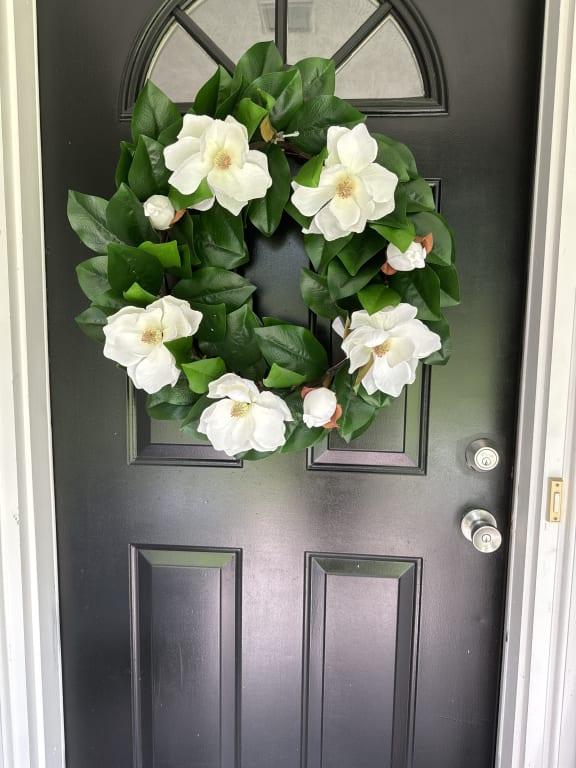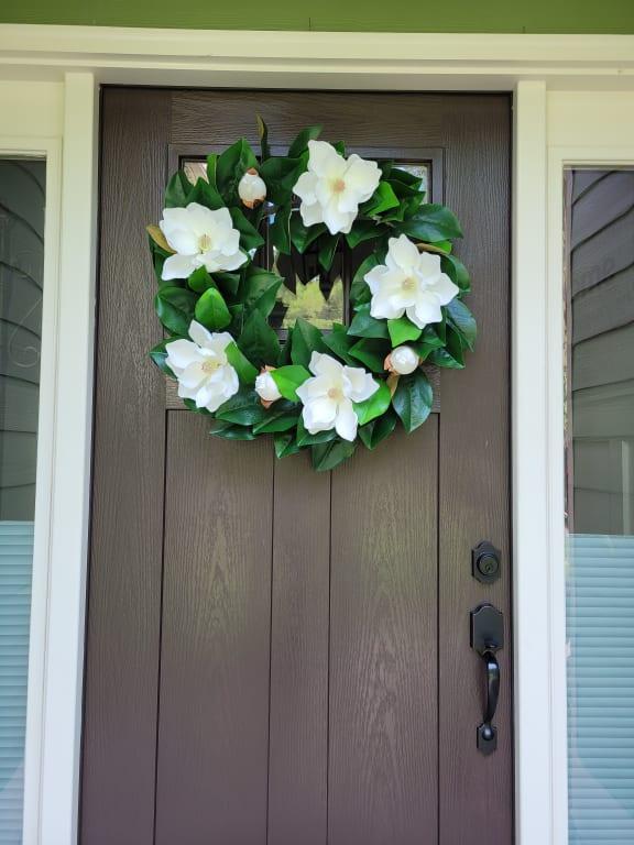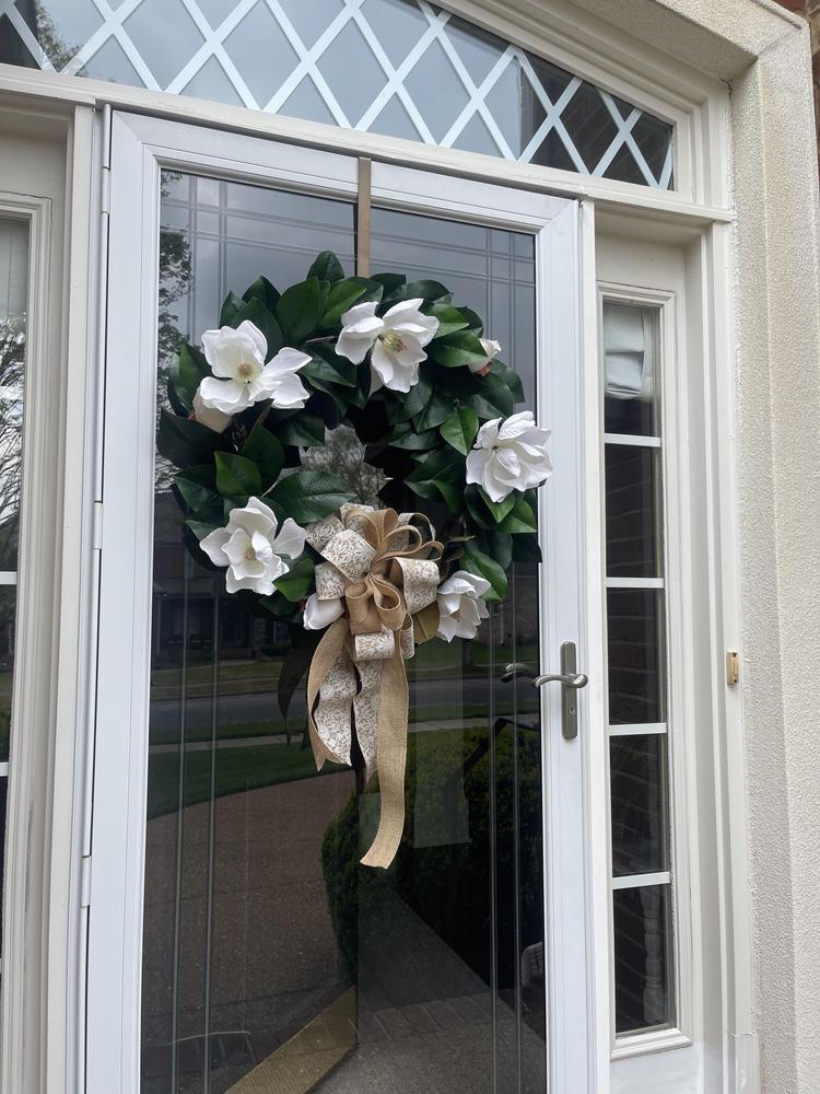 Elevate your home's decor with the charm of this white magnolia wreath. Its lush greenery and lifelike petals create a welcoming environment, making it an ideal addition to any room or event. With its timeless style, this wreath seamlessly blends into any aesthetic.