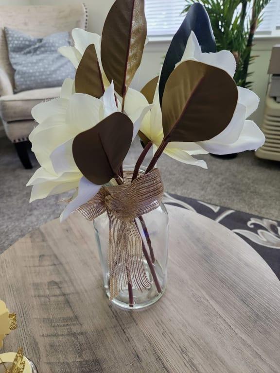 Our White Magnolia Flowers with Glass Planter are the perfect accessory to elevate your home decor. Whether placed on a coffee table, mantel, or bedroom dresser, these stunning flowers instantly create a serene and inviting atmosphere. The white color stands out against any backdrop, making it an ideal choice for both contemporary and traditional settings. Transform your space into a tranquil oasis with these beautiful magnolia flowers.