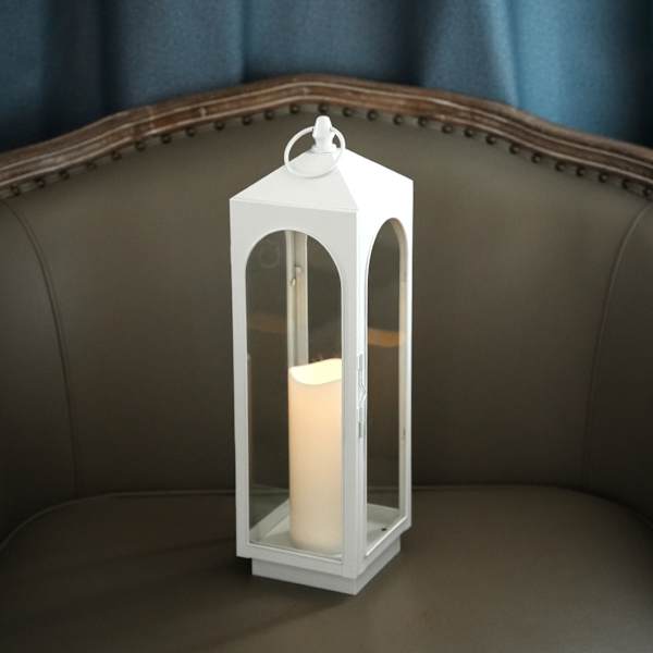 Bring a soft, ambient glow to your space with this 18in. White Metal LED Pillar Candle Lantern. This white lantern tucks neatly on a mantel, console, or tabletop. The crisp white metal frame and clear panels showcase the gentle flicker of the LED pillar candle for a clean, relaxed vibe. A simple loop handle lets you hang it or style it on a shelf with ease. Its timeless design blends with modern, coastal, and farmhouse decor. Display one for a subtle accent or group a few to create an inviting focal point.