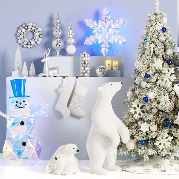 Invite wintry charm into your home with the 18in. Silver White Polar Bear with Baby. This Christmas animal decoration features a serene white bear and cub with a subtle silver shimmer that brightens mantels, shelves, and entryways. Crafted from polyester, the figurine blends smoothly with winter decor and modern holiday palettes. Style it with twinkle lights or evergreen garland for a cozy, snow-kissed scene. A heartwarming polar bear figurine that brings calm, festive spirit all season long.