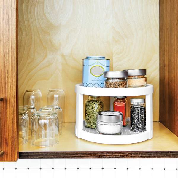 Streamline your cabinets with this white plastic turntable organizer. The 10in. round tray spins smoothly to bring items within easy reach, from cleaning supplies to bath essentials and craft tools. A raised rim helps keep everything in place as it rotates, while the easy profile tucks neatly onto shelves. The crisp white finish feels clean and modern and wipes down in seconds. Use it as a lazy susan in kitchen cabinets, bathroom vanities, laundry rooms, or workspaces for clutter-free storage.