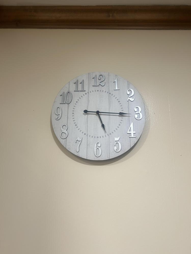 Ever feel like there just aren't enough hours in the day? Well, our whitewashed wall clock won't give you more time, but it will make time bigger-really big, as in a generous 14" across. It features soft grey numerals and bold black hands that really stand out. This farmhouse style wall clock will suit any room with its neutral colors and wood effect that gives it a slightly rustic look. Hang it in your kitchen or bathroom for a quick glance while you're getting ready for work and you'll never be late!