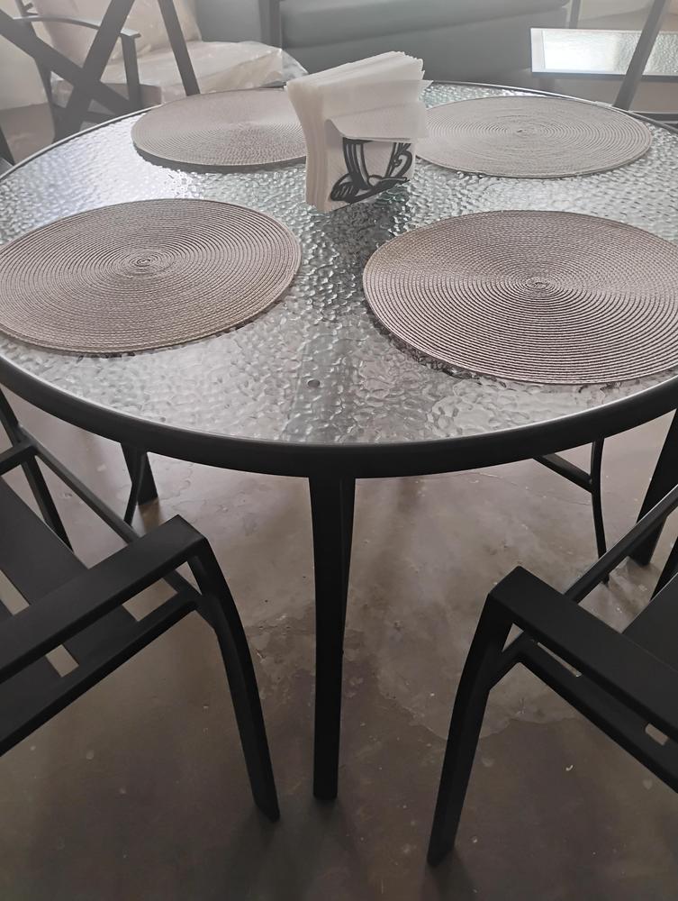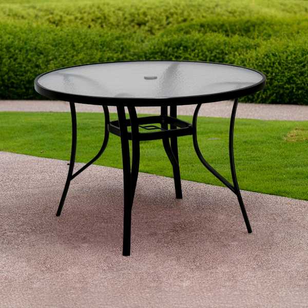 Our round 42in. outdoor dining table is built with longevity in mind. The frame is crafted from metal and painted in a sleek black paint, ensuring long-lasting use for many years to come. Made from metal painted in a sleek black hue, making it easy to clean and maintain. Whether you're hosting a large family gathering or a casual outdoor meal with friends, this outdoor dining table is an easy addition to your outdoor space, and it will accommodate an umbrella as well!
