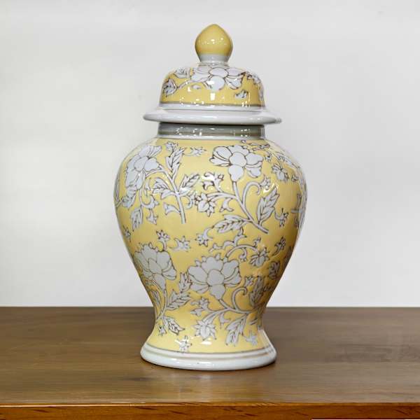 If your decor aesthetic is wide open, our 7x12in. Yellow Chinoiserie Porcelain Jar may be the element your home's been missing. This wonderful ceramic lidded ginger jar vase is absolutely superb with its yellow and white floral motif and dome-style top. Place it in your entryway, on the hearth or on a counter to add an amazing twist to your decor.