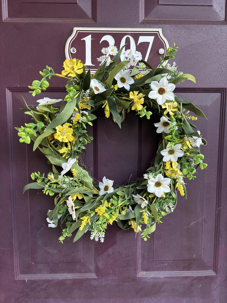 Elevate your decor with a burst of fresh color and the delightful scent of spring blossoms with this Hanging Floral Wreath. Its intertwined yellow and white mixed flowers create a cheerful and inviting ambiance, instantly transforming any space into a blooming garden.